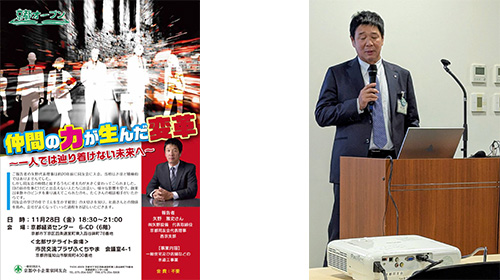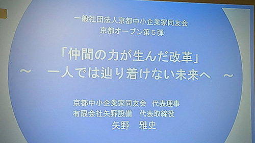 昨夜は年間6回開催される 各委員会主催の「京都オープン」で、 矢野 雅史 代表理事が登壇されました。同じ支部(西京支部)というご縁もあり〜過去数回ご報告を拝聴しているのですが、昨夜はひときわ 参加者の心に響くお話でした✨ 西京支部の幹事会で、 「参加して下さったゲストさんが、 同友会に入会したい❗️と思わせる報告にします」のご宣言通り〜! 私の横に座れていたゲストさんが 聴き入っておられました。 (間違いなく入会されるかと✌) "同友会の良さ等まだ何もわからない" ゲストさんに向けての話は、 「飾らない自身の実体験(失敗談必須)」これに勝るものはないと再確認➕笑いが取れるとさらに親近感UP♪ 「悩み続ける事が自社事業発展への道である」事を教えて頂いたと同時に、講師業を生業としている私は、 受講者さんをさらに〜! 「飽きさせない,惹きつける,記憶に残す」話術のスキルUP をしなければ〜! “講師料泥棒⁉️“だと教えて頂いた気分です😅