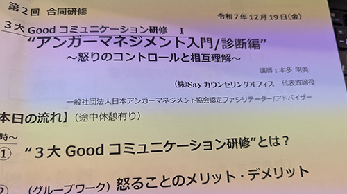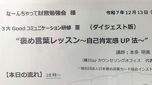 今春から新しくご縁を頂いた 介護事業と神戸日語学院を経営されている尼崎市内の企業様の 「3大Goodコミュニケーション研修」無事3回終える事が出来ました♪ キックオフは〜 9月の「アンガーマネジメント研修」 そして何と!本日は終日✨ 午前「正しい叱り方〜部下のやる気を損なわない言葉〜」 午後「褒め言葉レッスン〜自己肯定感UP法〜」 対象は日本語講師の先生方と事務方の皆様でしたが、 授業のないオフの日に、 非常勤講師の先生方まで進んで参加して頂きました✨ とにかく皆さん熱心な方々ばかりで〜✨ グループワークは毎回和気あいあい♪盛り上がり過ぎて⁉️「ストップ」かけずらかったくらいです😅 質問もその都度して頂き、 通常の2倍の長丁場にも関わらず! 「2研修あっという間でした。 ロープレやゲームもっとしたかった❣️」など等… 大変嬉しいご感想(アンケート)を 頂きました。 今年最後の研修2本でしたが、 講師自身も楽しく過ごさせて頂き♪記憶に残る日になりました🙇♀